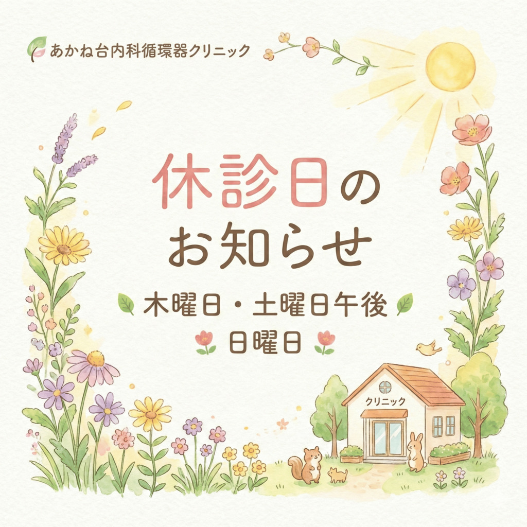 いつもお世話になっております。 2025年12月28日〜1月4日は休診とさせていただきます。よろしくお願いします。 あかね台内科循環器クリニック 045-961-5007