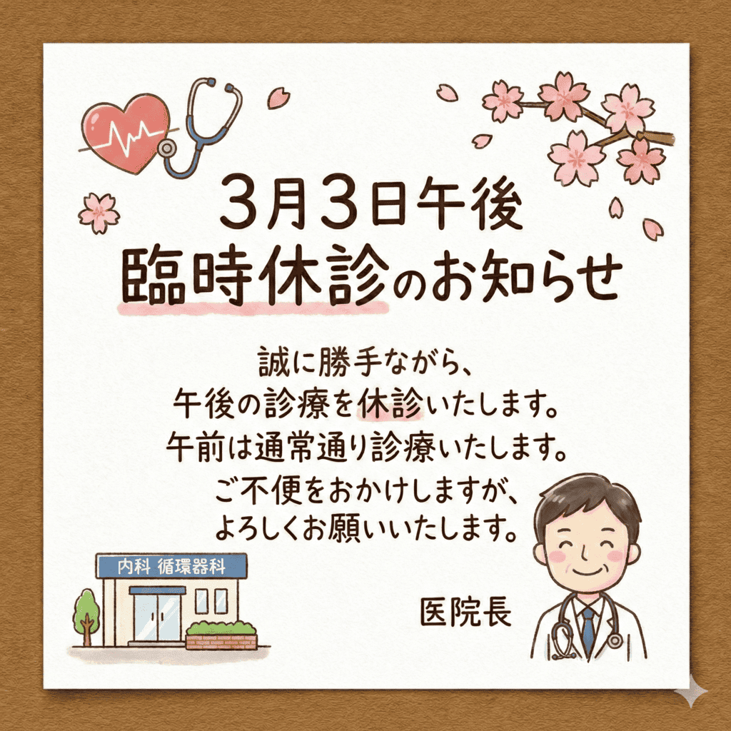 いつもお世話になっております。 2026年3月3日(火)午後は臨時休診とさせていただきます。よろしくお願いします。 あかね台内科循環器クリニック 045-961-5007